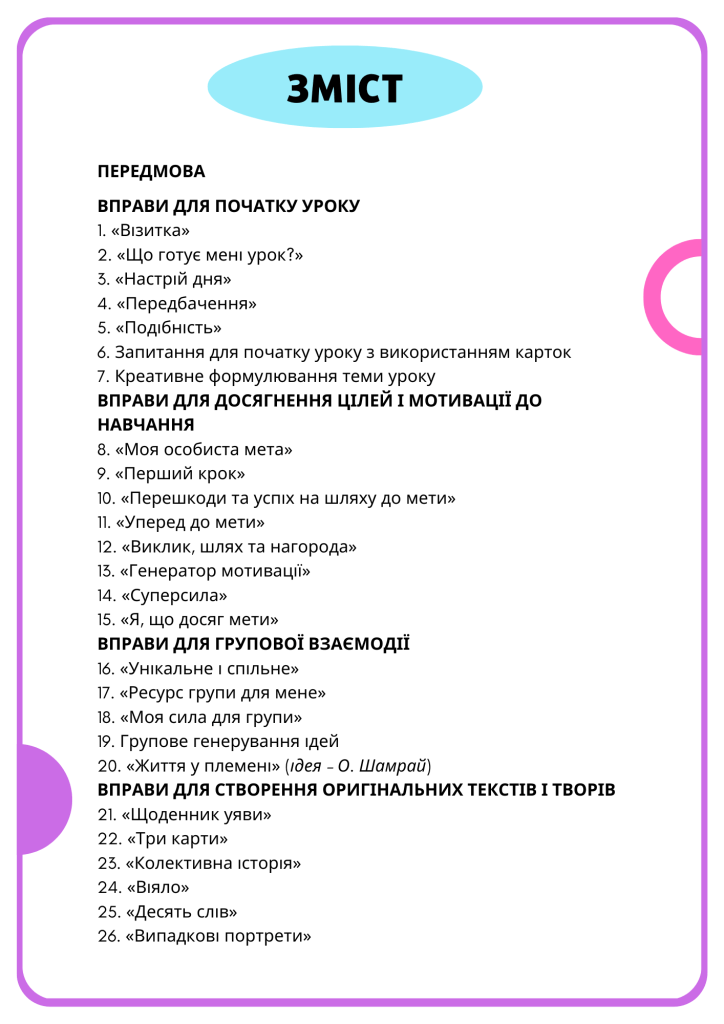 Усі вправи універсальні: їх можна використати на уроках мови, на природничих предметах, під час вивчення точних дисциплін, і навіть у виховних заходах.
