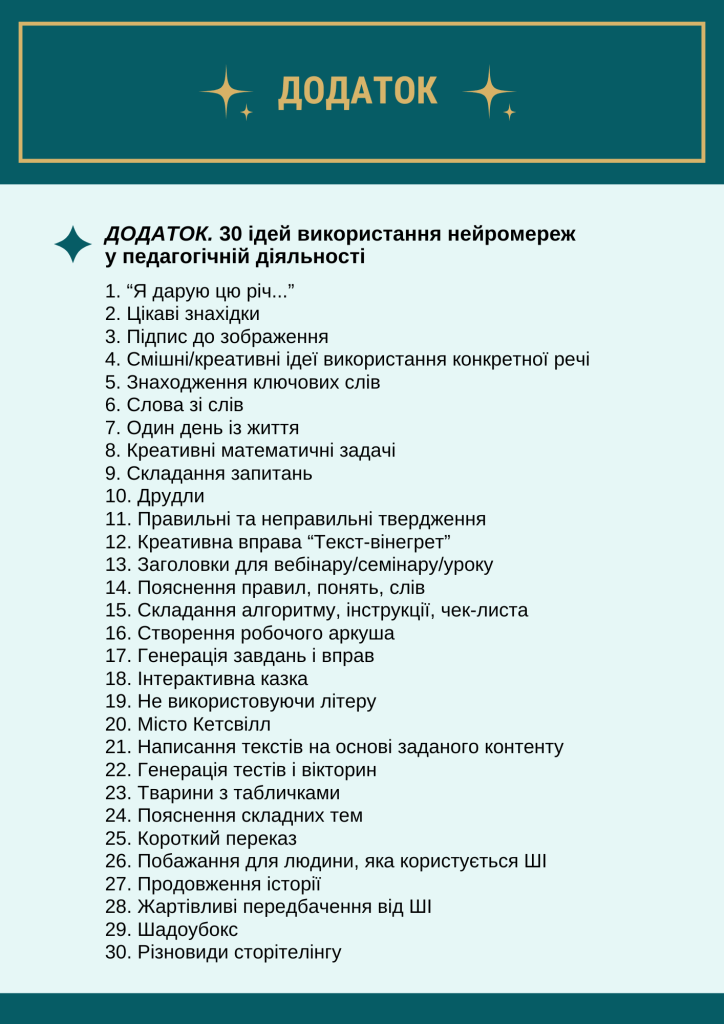 3) практична частина – додаток “30 ідей використання нейромереж у педагогічній діяльності”. Це вправи і завдання для творчого застосування інструментів ШІ на уроках (“Цікаві знахідки”, “Я дарую цю річ…”, “Слова зі слів”, “Текст-вінегрет”, “Друдли”, “Місто Кетсвілл”, “Інтерактивна казка”, “Робочий аркуш”, “Продовження історії”, “Тварини з табличками” та ін.).