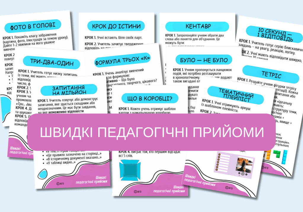 Свіжі універсальні техніки, що підійдуть для викладання будь-якого навчального предмета. Вправи для початку уроку, освоєння нового матеріалу, групової роботи, вправи-розминки, інтерактивні ігри, прийоми на завершення уроку.