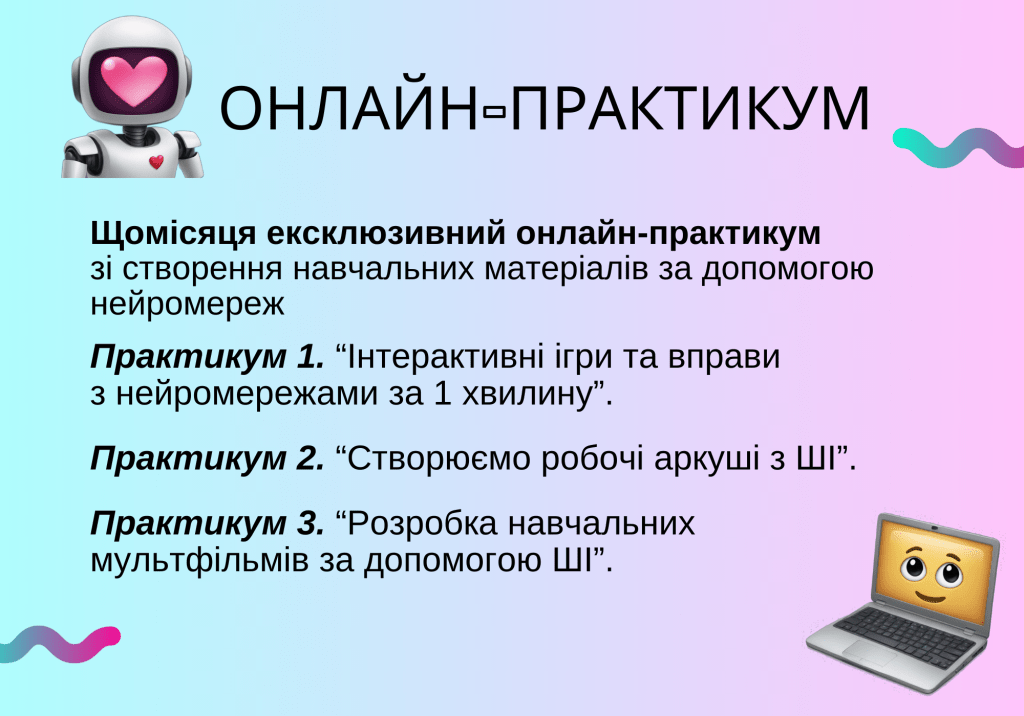 У «Клубі AI» ви одразу переходите до дії: вже з першого тижня створюєте власні інтерактивні й ефективні матеріали для уроків.