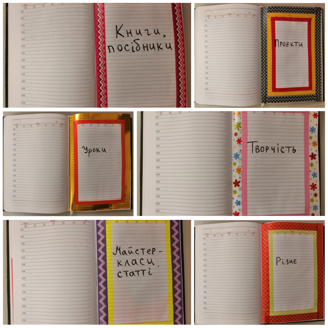 І вдосконалила: зробила в зошиті декілька розділів: «Книги, посібники», «Уроки», «Майстер-класи, статті», «Проекти», «Творчість», «Різне».
