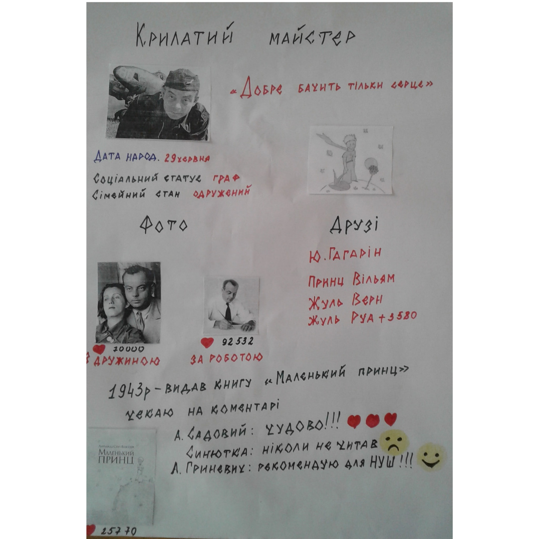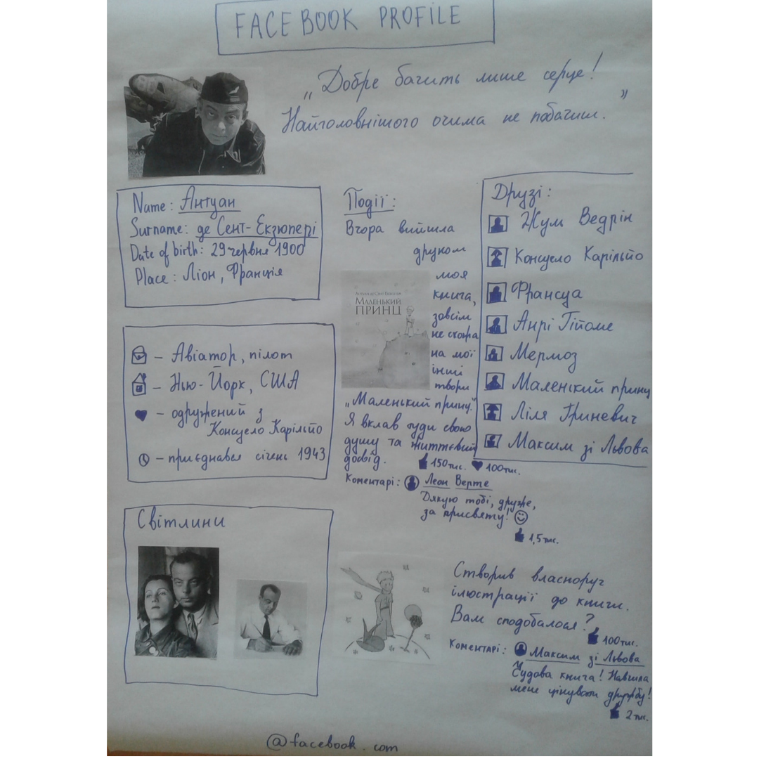 Завдання. Уявіть, що А. Сент-Екзюпері живе в наш час і має свій профіль у соціальній мережі. Представте у творчій формі біографію письменника, використовуючи формат Facebook-сторінки.