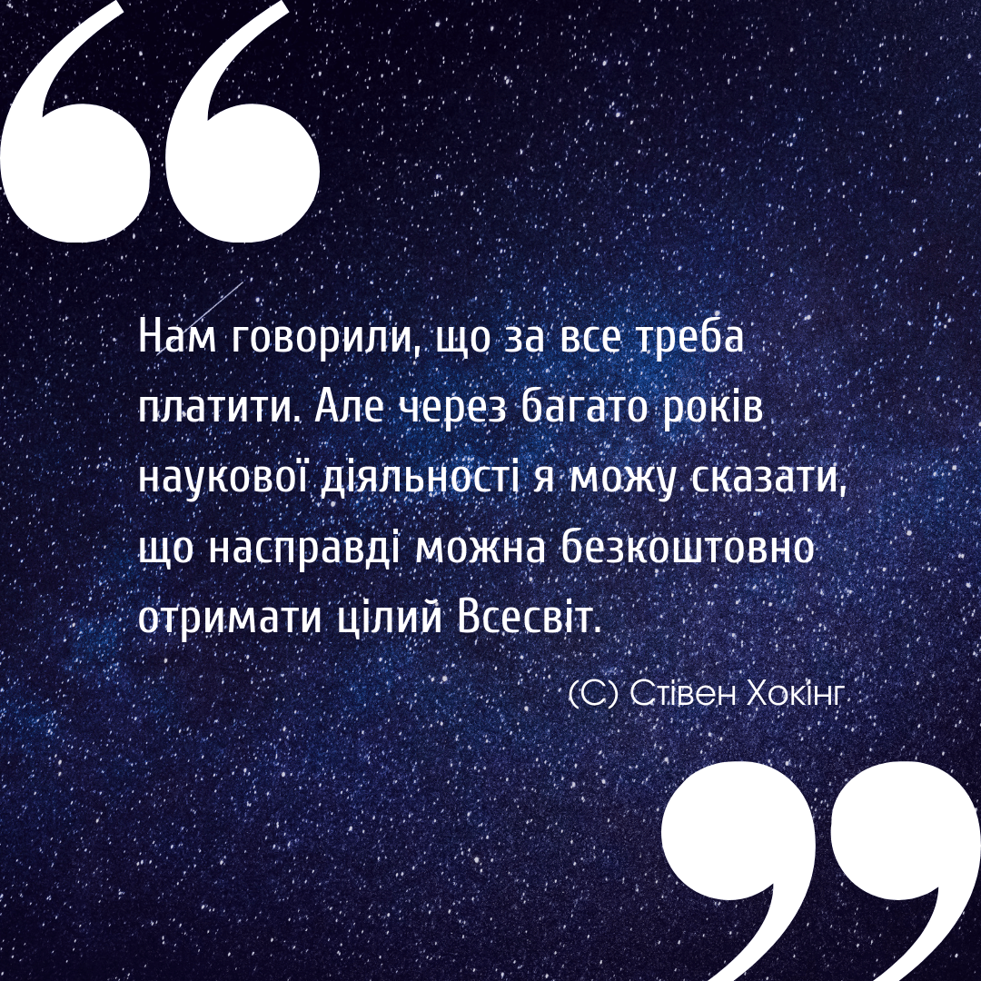 “Можна безкоштовно отримати цілий Всесвіт!” Стівен Хокінг Поделиться ссылкой: Share on X (Відкривається у новому вікні) X Поділитися на Facebook (Відкривається у новому вікні) Facebook Подобається Завантаження… Пов’язано Залишити коментар Скасувати відповідь Δ