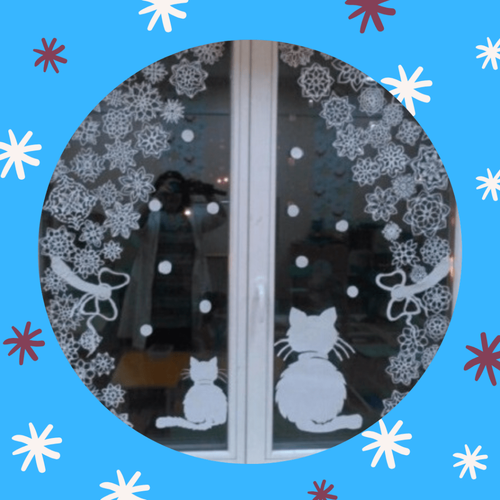 Вікна класу можна оформити трафаретними білими або блакитними малюнками зимової тематики, але зовсім небагато.