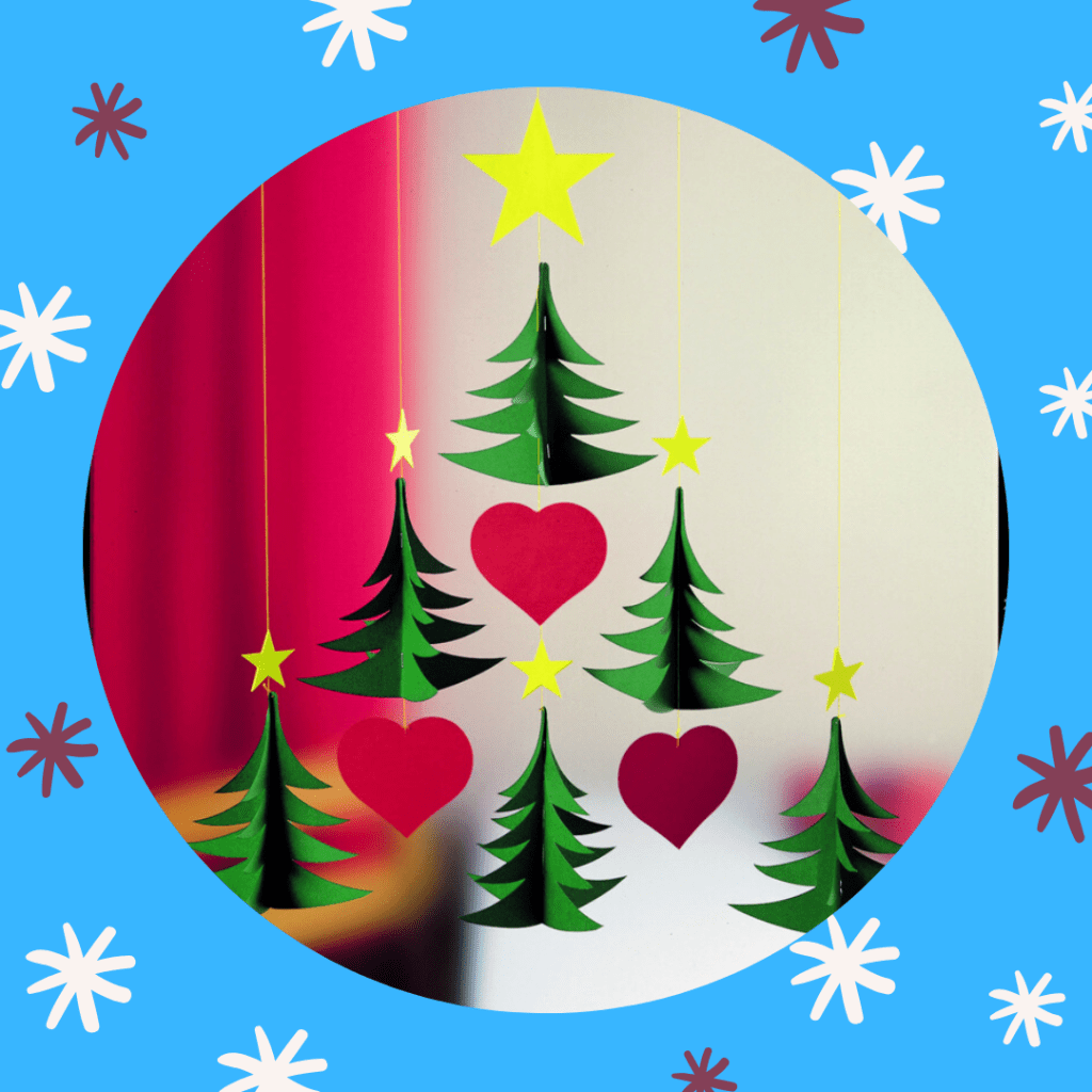 Стелю прикрасьте сніжинками, ялинками або кольоровим дощиком, які кріпляться за допомогою ниточки або англійської шпильки.