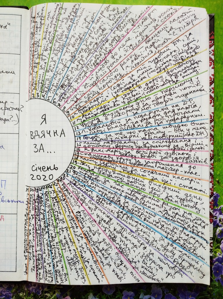 Щовечора протягом січня відкривала цей аркуш з веселковими променями і записувала кілька слів про те, кому і за що була вдячна за цей день.