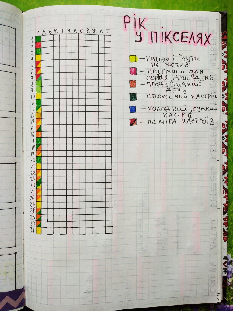 Переважають кольори жовтий (краще і бути не могло), помаранчевий (продуктивність) і зелений (спокій). На початку січня трошки червоного (особливі для душі, серця дні).