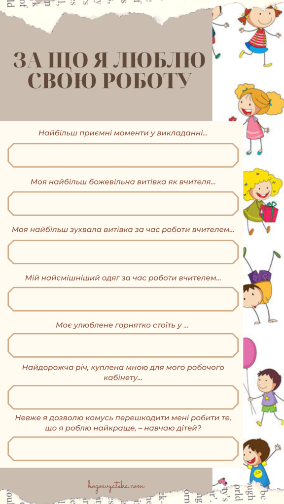 Для сьогоднішньої теми я теж створила два чек-листи у вигляді опросників. Головні ресурси ми черпаємо всередині себе. Замисліться, будь ласка, над запитаннями про своє місце в професії учителя, про те, наскільки цінним для вас є те, що ви робите. Сподіваюсь, заповнювати їх вам буде і приємно, і корисно. І ви зайвий раз подякуєте Богу, що він вклав у ваше серце обрати саме цю професію.