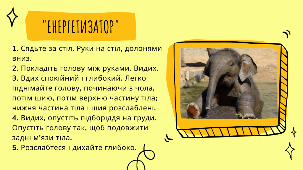 Вправу можна виконувати як розминку після написання диктанту, розв’язування математичних задач, або під час тривалої роботи за комп’ютером.