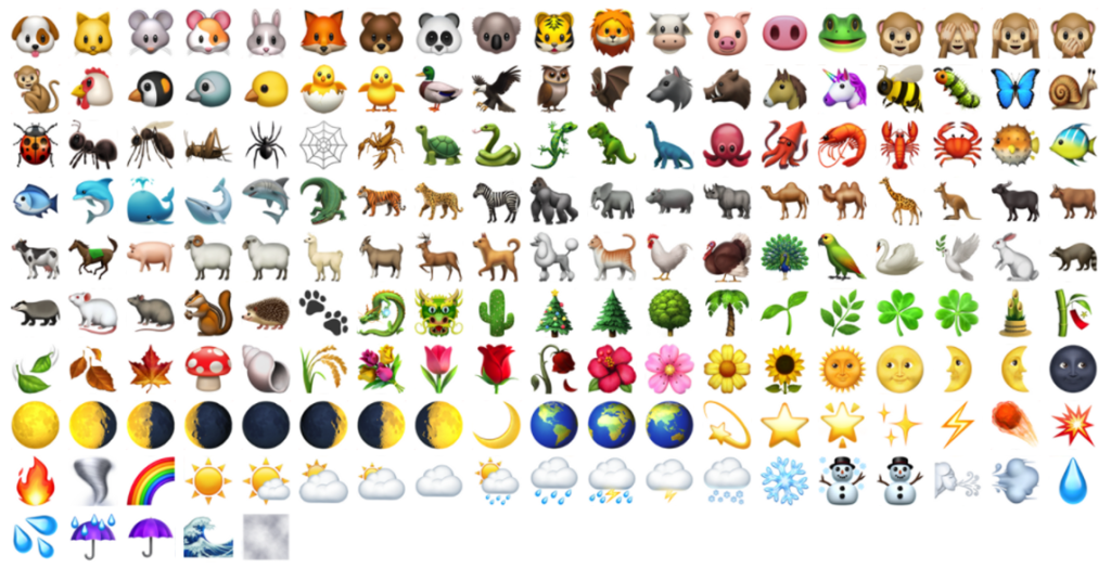 2) емодзі, що відображають природу – тваринний і рослинний світ, явища всесвіту, погоду: