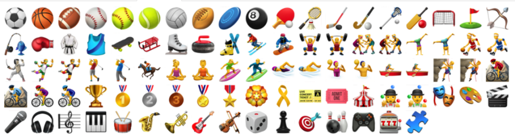4) емодзі з зображенням видів спорту і мистецтва: