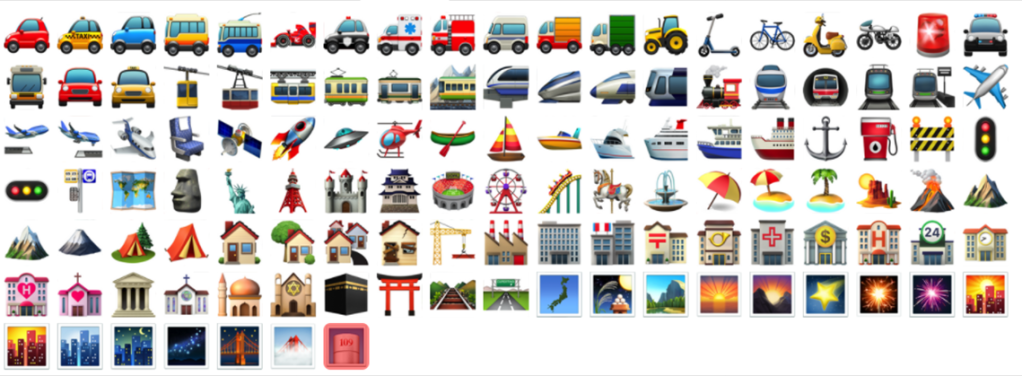 5) емодзі, що відображають подорожі, види транспорту і події: