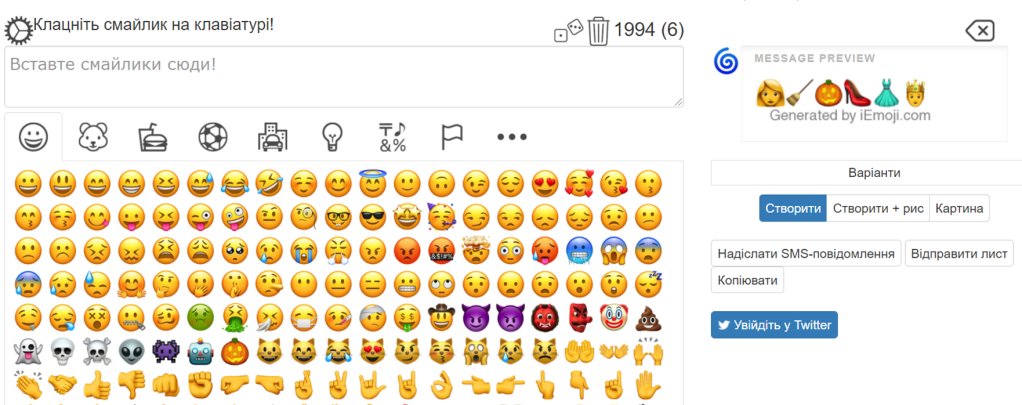 Шукаю піктограми у відповідних групах емодзі і натискаю на них. Вони по черзі з’являються у великому вікні і дублюються у меншому вікні праворуч, де можна проглядати весь сюжет цілком.