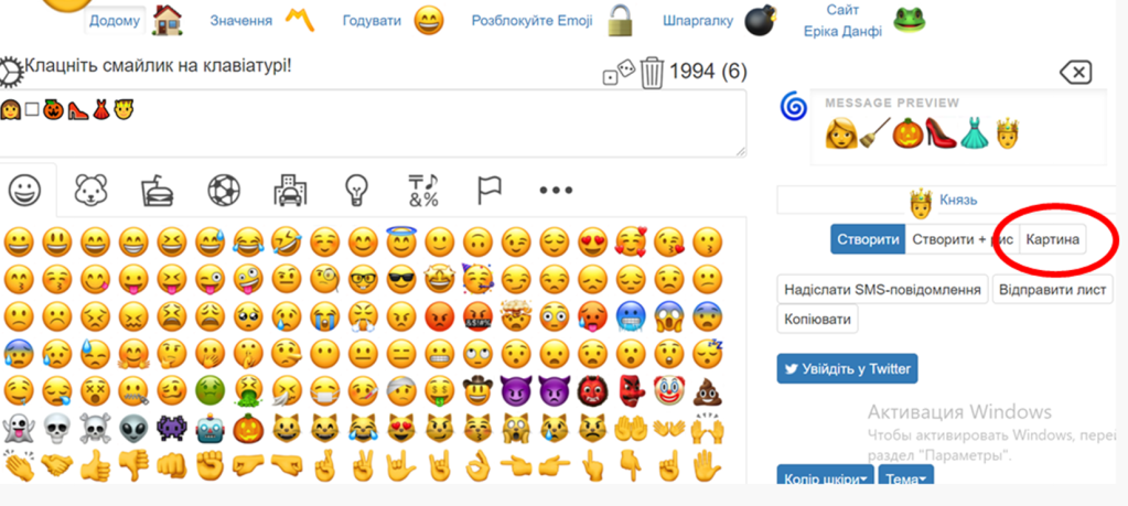Прямо перед собою бачимо велике вікно, куди будемо вставляти потрібні піктограми і смайли. Наприклад, я хочу зашифрувати назву казки «Попелюшка».
