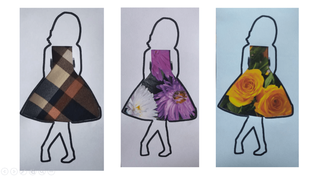 Завдання: створити одяг для героїні твору, підібрати фон для цього трафарета сукні: такий колір, фактуру, структуру тканини, яка б передавала її риси характеру, світогляду, душевне наповнення.