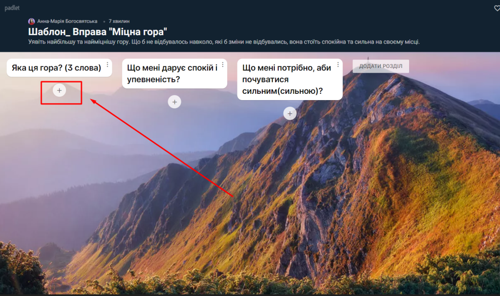 Розробила зранку вправу для спільної роботи «МІЦНА ГОРА» на онлайн-дошці Padlet.