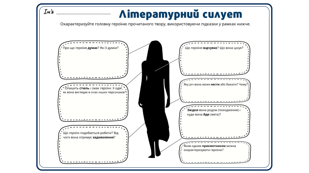Є другий аналогічний шаблон “Літературного силуету”, що стосується вже аналізу чоловічих персонажів. Ці вправи входять до другої частини воркбуку “50 сучасних стратегій залучення учнів до читання”, що містить 50 нових креативних робочих листів, проєктів, роздруківок у форматі А4 (про першу частину воркбуку можна дізнатися тут)
