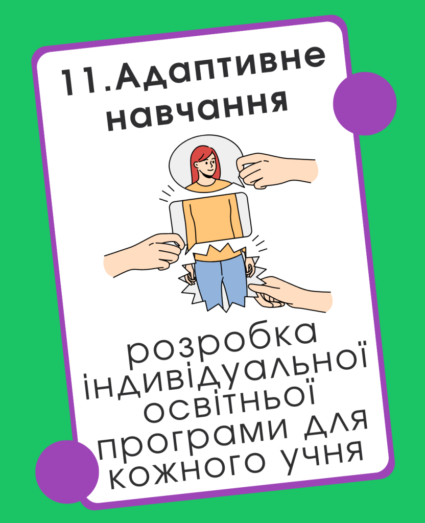 Основне завдання адаптивного навчання – розробка індивідуальної освітньої програми для кожного учня. При складанні такої програми до уваги береться бажання дитини поліпшити певні знання.