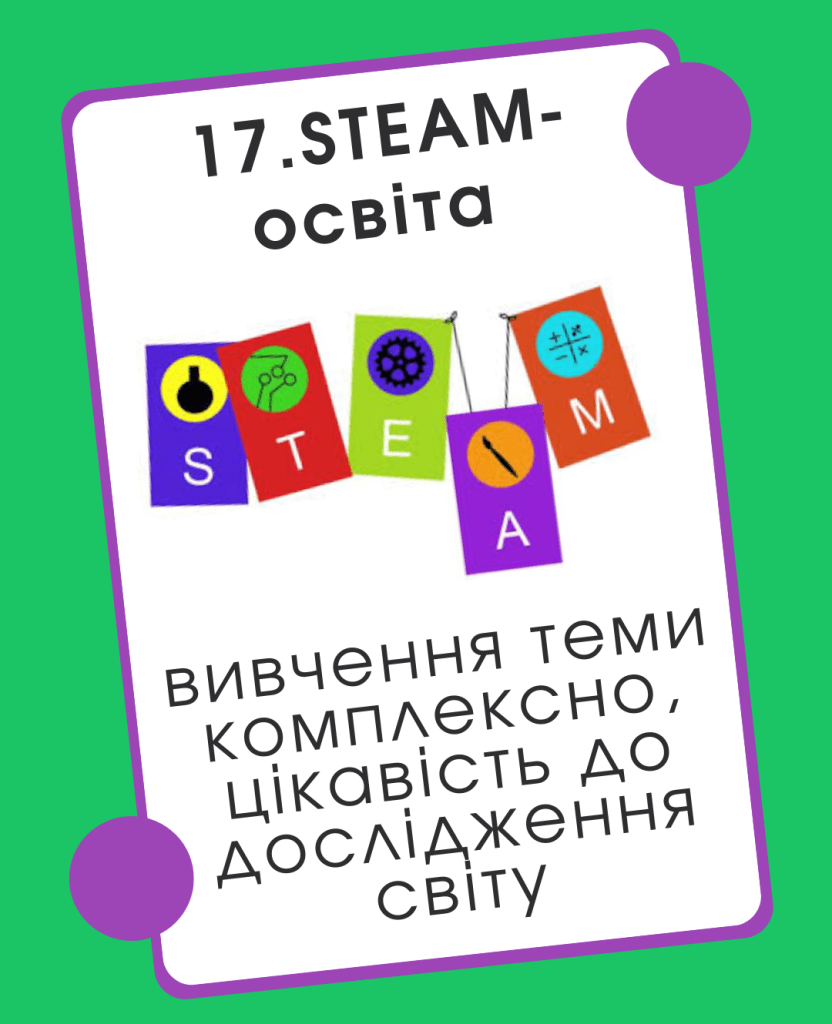 STEAM = Science, Technology, Engineering, Arts, and Mathematics – природничі науки, технологія, інжиніринг, мистецтво, математика.