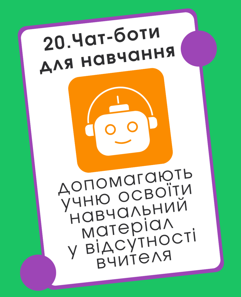 Чат-боти – один із нових інструментів у навчанні. Вони володіють функціоналом, що дозволяє відповісти на запитання учня і поставити власні запитання, а також допомагають учню освоїти навчальний матеріал навіть у відсутності вчителя. Чат-боти здатні пояснити базові правила, вказати місце в підручнику або покликання в інтернеті, надсилати нагадування та проводити невеликі опитування.