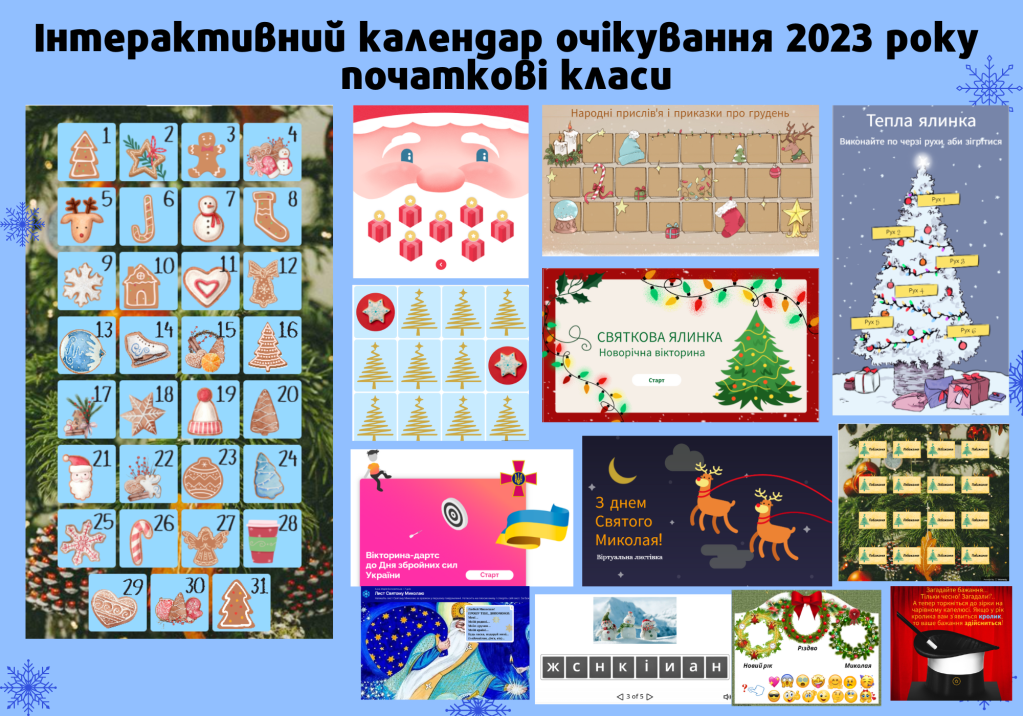 Створила два інтерактивні «Календарі очікування 2023 року» з вправами для кожного дня з 1 по 31 грудня (для початкових класів і для 5-11 класів).