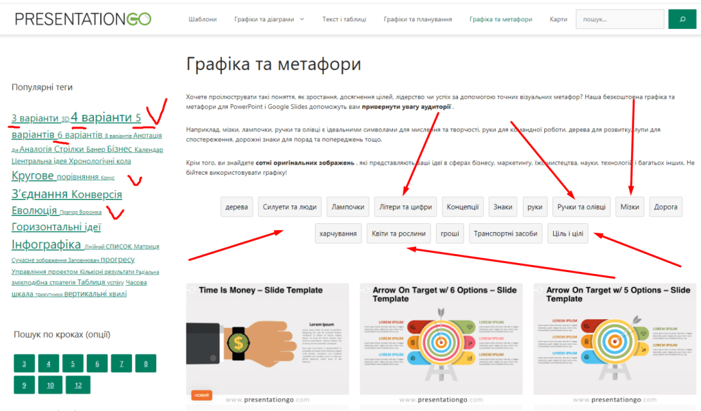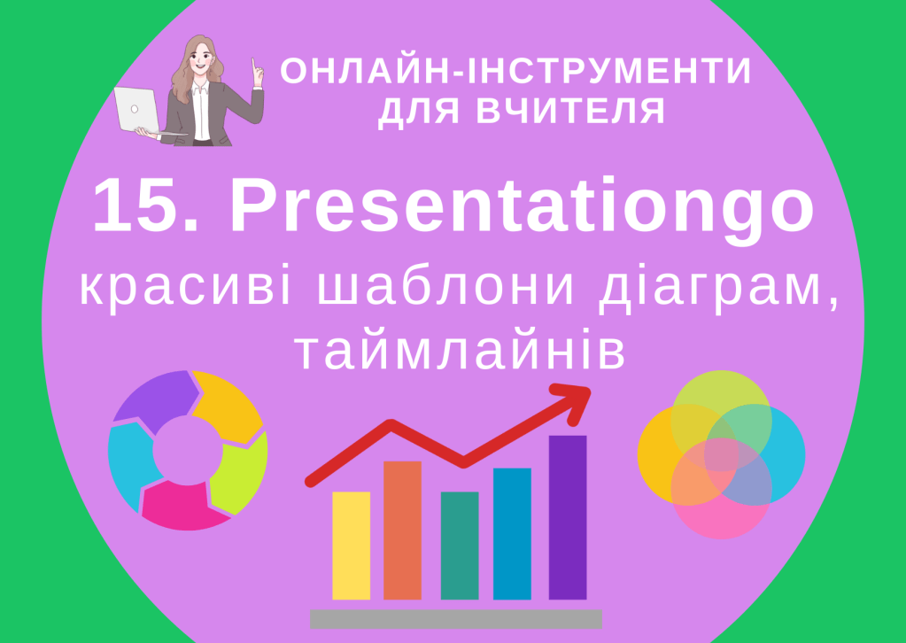 Безкоштовні шаблони для вчителя з красивими діаграмами, графіками, лініями часу (таймлайни). Причому є меню, де ви можете обирати потрібну вам кількість елементів на слайді: 3 елементи для діаграми, 4, 5, 6…