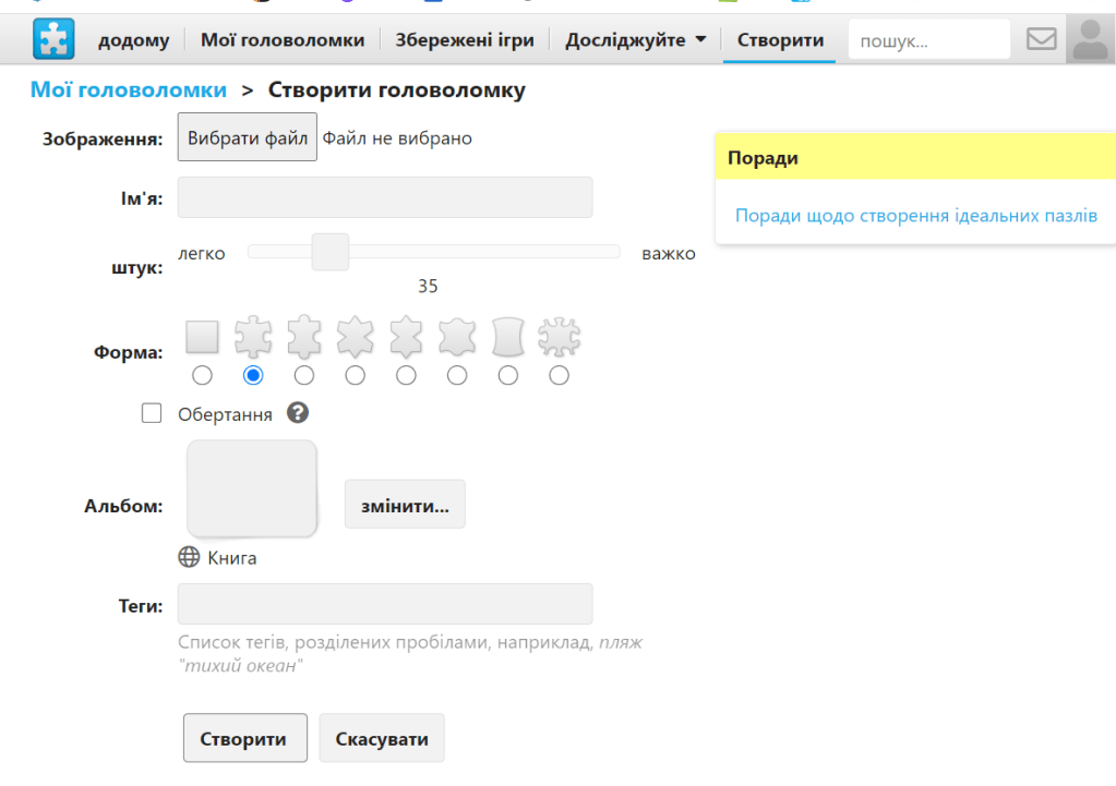 Легкий генератор для створення пазлів. Обирайте різні форми фрагментів пазлу, кількість фрагментів (12, 24, 35 та більше). Завантажуйте будь-які картинки, фотографії, портрети письменників, зображення країн. Та творчо інтегруйте вправу в свої уроки!