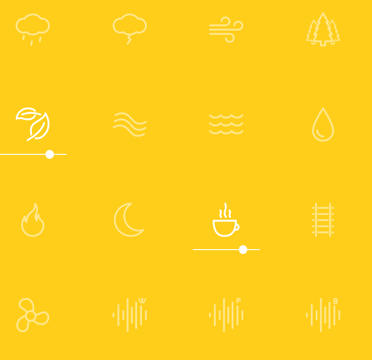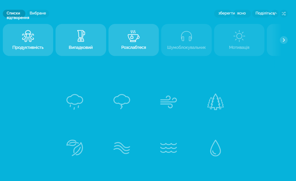 Оберіть готовий набір звуків для станів «продуктивність», «розслабитись», «випадковий». На платному тарифі можна додатково обрати комбінації звуків для станів «мотивація», «навчання», «сон», «творче мислення», «красиве оточення», «письменництво».