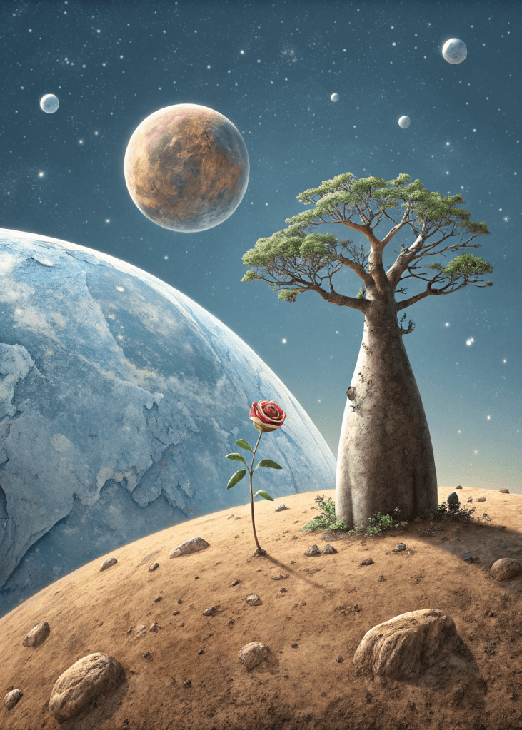 Баобаби – це персоніфікований образ зла взагалі. А. Сент-Екзюпері хотів, щоб люди турботливо викорчовували баобаби, які несуть у собі зло та можуть розірвати планету – внутрішній світ людини – на частини.
