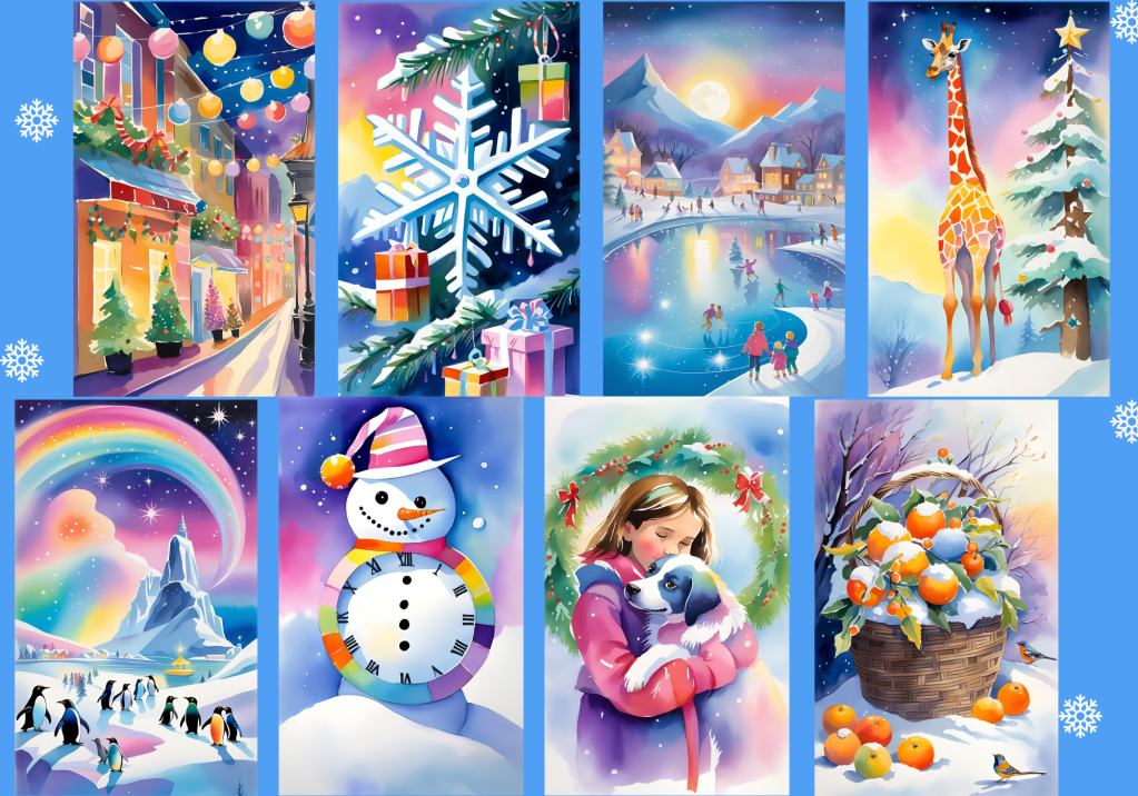 До комплекту також додається електронна колода асоціативних карт, створена спеціально для педагогів та учнів за допомогою нейромережі Dream.ai, преміальний стиль Watercolor_v3. Можливості штучного інтелекту дозволили втілити незвичайні зимові образи, відтінки сніжних кольорів, різдвяних персонажів, та найголовніше – створити відчуття яскравих веселих зимових свят. Зміст «Карт вражень» – візуально привабливі багаторівневі образи: різдвяна символіка, діти, домашні улюбленці, веселі дикі тварини, зимові пейзажі, святкові ситуації. Ви можете роздрукувати колоду карт і використовувати їх у паперовому варіанті або додати 4-8 електронних зображень на слайд і демонструвати учням на екрані.