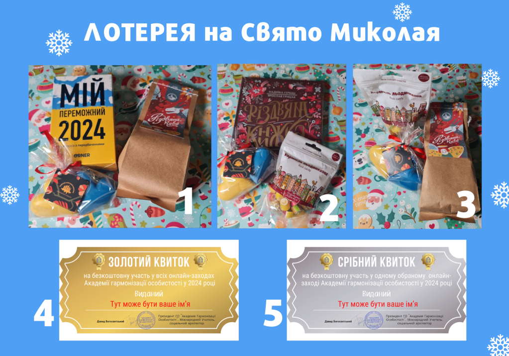 ❄️5-й лот. Срібний квиток: безкоштовна участь у одному на вибір онлайн-заході Академії гармонізації особистості в 2024 році.