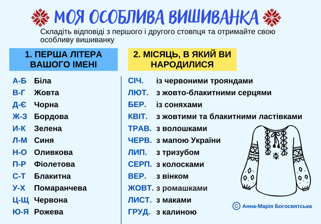 Потрібно об’єднати відповіді з першого та другого стовпця та написати, яка ваша особлива вишиванка.