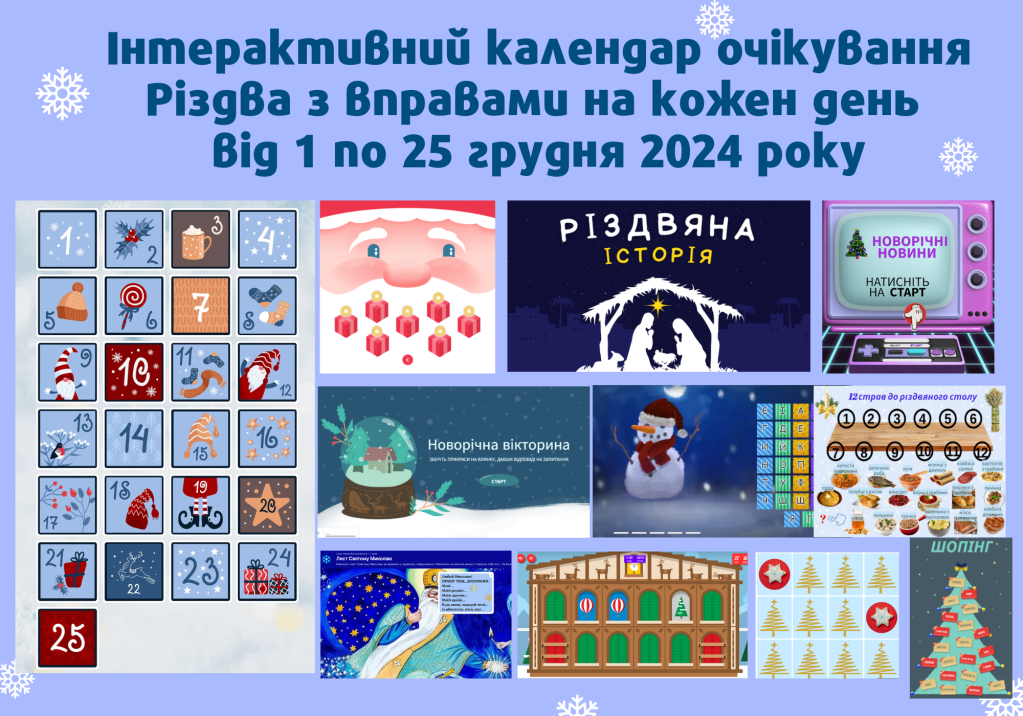 🎄1. Інтерактивний календар очікування Різдва з завданнями-сюрпризами на кожен день від 1 по 25 грудня 2024 р. (3 – 9 класи)