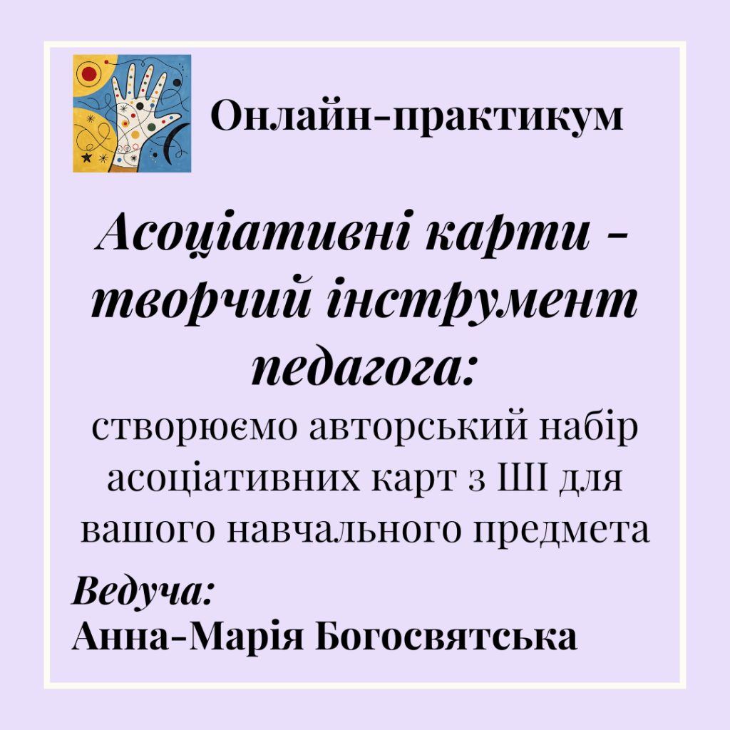 9 січня 2025 р. відбувся онлайн-практикум “Асоціативні карти – творчий інструмент педагога: створюємо авторський набір асоціативних карт з ШІ для вашого навчального предмета”.