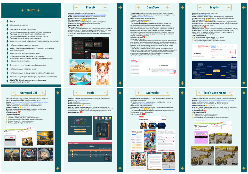 3) практична частина – додаток “30 ідей використання нейромереж у педагогічній діяльності”. Це вправи і завдання для творчого застосування інструментів ШІ на уроках (“Цікаві знахідки”, “Я дарую цю річ…”, “Слова зі слів”, “Текст-вінегрет”, “Друдли”, “Місто Кетсвілл”, “Інтерактивна казка”, “Робочий аркуш”, “Продовження історії”, “Тварини з табличками” та ін.).