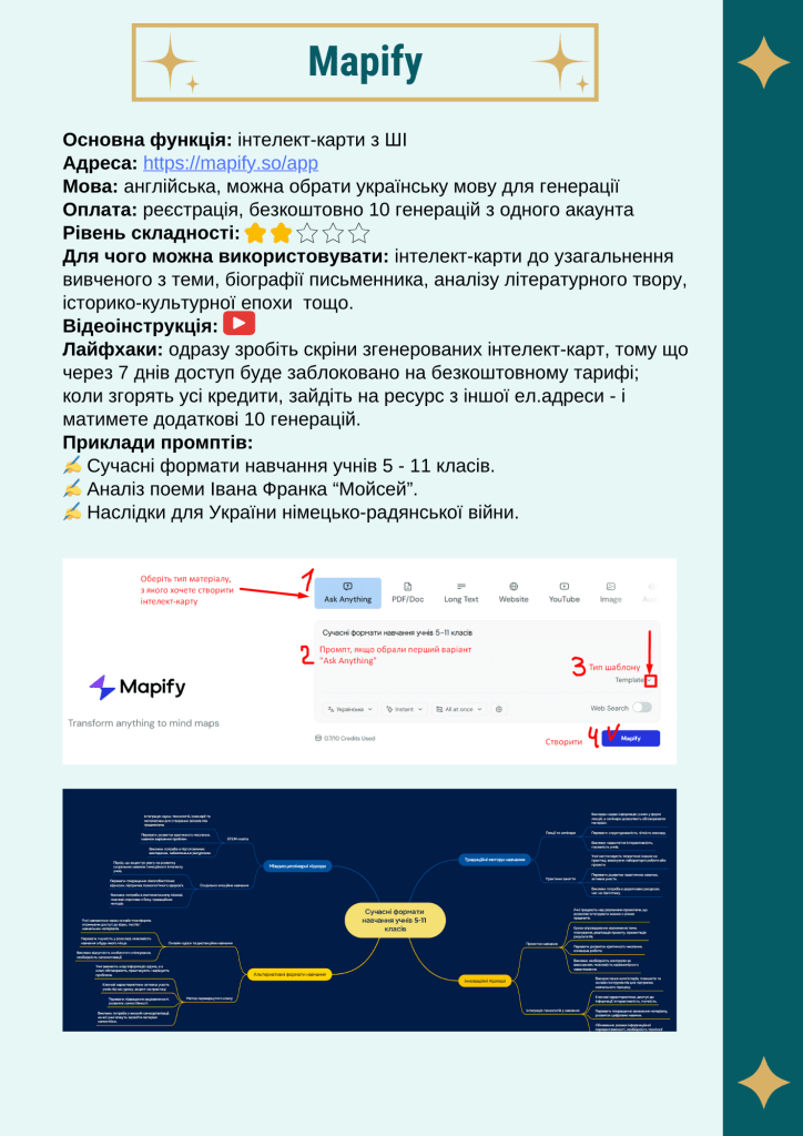 Ви дізнаєтеся, як ефективно застосовувати нейромережі для підготовки до уроків, для оцінювання знань і створення дидактичних матеріалів: інтелект-карт, інфографіки, часоліній, флеш-карток, електронних презентацій, робочих аркушів, опитувань, інтерактивного навчального контенту, мелодій, відео, коміксів, мемів та інших креативних сучасних форматів.