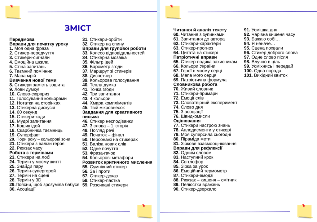 Усі вправи універсальні: їх можна використати на уроках мови, на природничих предметах, під час вивчення точних дисциплін, і навіть у виховних заходах.