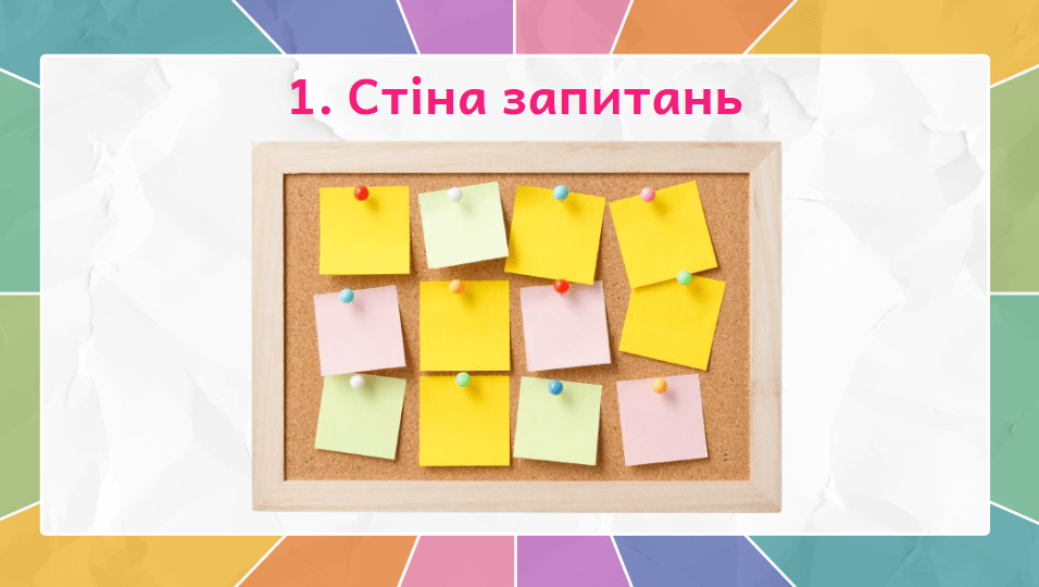 Заздалегідь підготуйте на дошці великий плакат з назвою «Стіна запитань». Попросіть учнів написати на стикерах усе, що вони хочуть дізнатися про цю тему, і приклеїти їх на плакат.