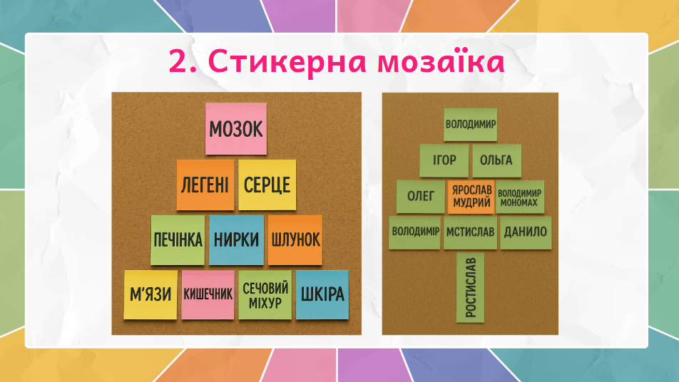 Група отримує завдання: створити відповідь у формі мозаїки зі стикерів. Кожен пише одну думку, приклад чи аргумент, і разом вони компонують візуальну відповідь – колаж, піраміду, дерево тощо. Відповідь оживає, стає різнобарвною і колективною.