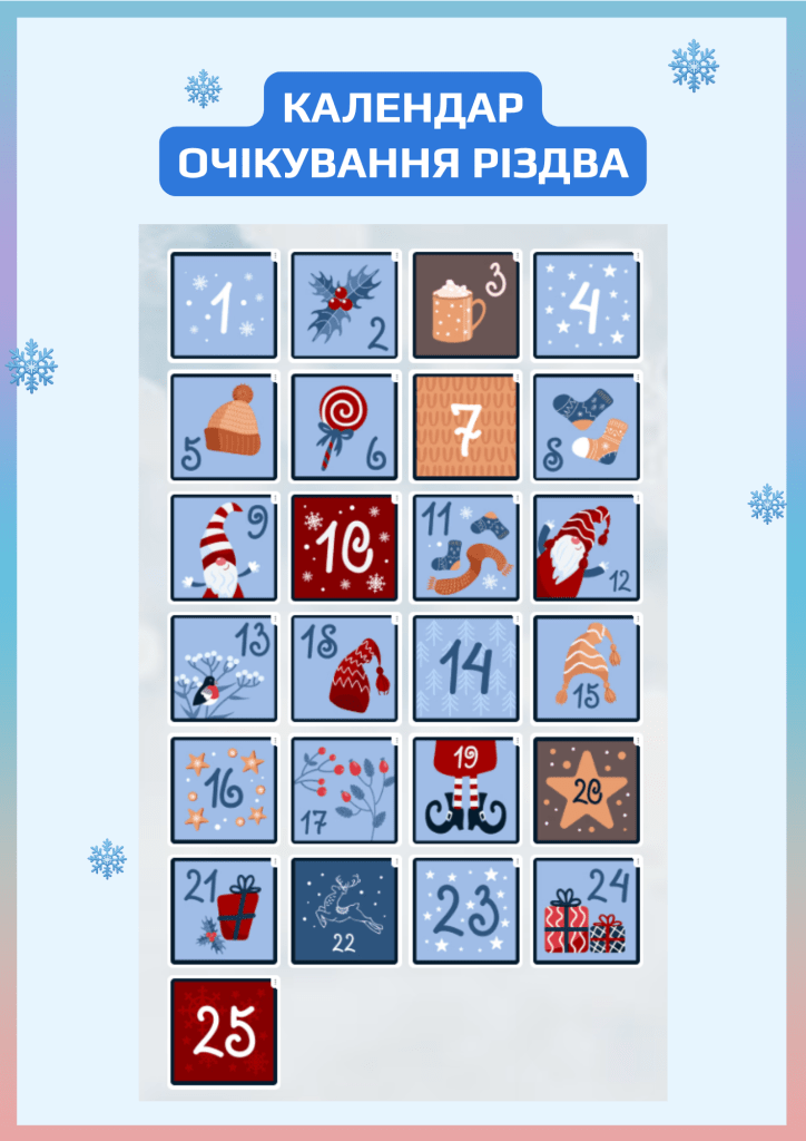 1. Календар, завдання на якому з’являються поступово, по одному, о 6:00 в кожну дату від 1 по 25 грудня 2025 р.